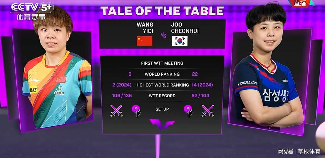 在前两位种子陈幸同和蒯曼爆冷出局、孙颖莎和王曼昱又没有参赛的情况下,世界排名第5位的王艺迪自然也就成为了最大的夺冠热门,上一轮也是击败了劲敌张本美和。是一名韩国队的小将,实力不俗,上一轮淘汰了桥本帆乃香,状态出色。两人之间的胜者,将会在决赛对阵温特,后者4-1爆冷淘汰了申裕斌、率先晋级到了决赛,这是两人在WTT赛事的首次交手。