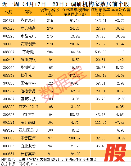 近一周机构调研个股有350多只,鼎泰高科调研机构数最多。